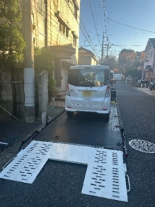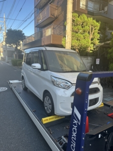 住宅街の片側一車線で停車中のスペーシアの搬送依頼をいただきました。朝の時間帯で車通りも少なく、積載車を後方から寄せられる良好な環境でした。