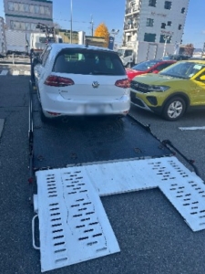 販売店の広い駐車場でゴルフGTIをお預かりしました。周囲に展示車が並ぶ環境で通行が限られていたため、積載車を正面から配置して作業スペースを確保しました。