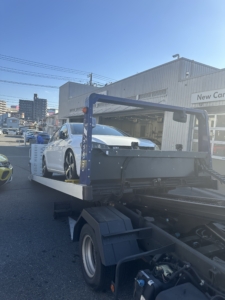 積み込み後、周囲の展示車と歩行者動線を再確認し場内を離脱。指定先まで安全に搬送を完了し、お客様からは「低い車なので心配でしたが、丁寧に扱っていただき安心しました」とのお言葉をいただきました。