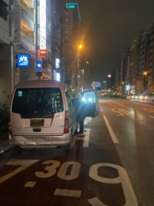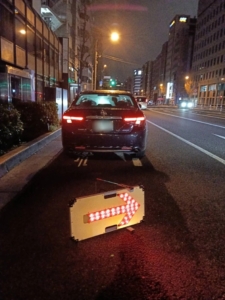 深夜とはいえ交通量の多い都内の幹線道路でしたので、まずは後続車へ危険を知らせる電光の矢印板を設置し、周囲の安全をしっかりと確保いたしました。その後、積載車へ迅速にお車を引き上げ、専用のベルトでタイヤをしっかりと固縛し、約30分で安全に積み込み作業を完了いたしました。