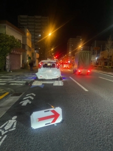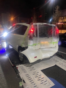 深夜の交通量がある道路での作業となりましたので、まずは後続車へ危険を知らせる矢印板を設置して周囲の安全をしっかりと確保いたしました。その後、割れたリアガラス部分をビニールとテープで丁寧に養生を行い、積載車(フラットベッド)へ慎重に引き上げました。安全確認を徹底しながら、約45分で無事に積み込み作業を完了させております。