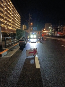 深夜の幹線道路沿いでの作業となりましたが、お写真のように矢印板を設置して後続車への安全喚起をしっかりと行いながら、積載車へ慎重に引き上げました。積み込み後は、バイク専用のタイダウンベルトを使用して車体を四方からしっかりと固定し、輸送中の揺れにも耐えられるよう安全を確保して約30分で作業を完了いたしました。