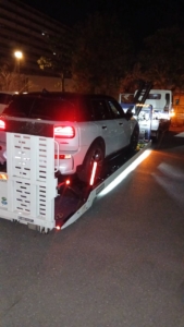 タイヤがパンクして空気が抜けてしまっており、安全な走行が不可能な状態でした。深夜ということもあり、開いている修理工場やタイヤショップもない時間帯でしたので、まずは安全確保を最優先に、お車を積載車(フラットベッド)へ慎重に積み込みました。
