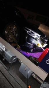 HD様のお車はこだわりのアルミホイールやエアロパーツが装着され、ローダウンされている大切なお車でした。弊社ではこのようなカスタム車両の取り扱いにも慣れておりますので、牽引フック周りに保護用のウエスを当てるなど細心の注意を払い、バンパーや下回りを擦らないよう約30分で慎重に積み込み作業を完了させております。