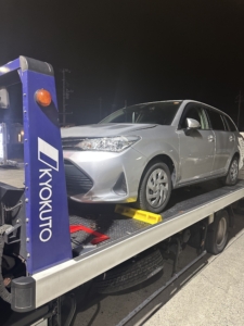 夜間の作業となりましたが、ガソリンスタンド付近の安全な場所で周囲に配慮しながら、約30分で迅速かつ慎重に積み込みを完了いたしました。その後、お車は弊社で安全にお預かりし、お写真にもある通り、後日ご指定のトヨタディーラー様へ無事にお引き渡しいたしました。
