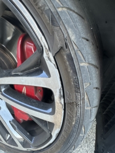 縁石のような段差に乗り上げてしまったようで、お写真の通りタイヤの側面が大きく裂けてバーストしており、ホイールにも痛々しい傷が入ってしまっている状態でした。このままでは完全に自走不可能なため、積載車にて安全に引き上げ作業を行いました。