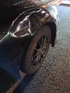 左側のリアフェンダーからドアにかけて大きく凹むような損傷があり、タイヤ付近にもダメージが及んでいる状態でした。このまま無理に走行を続けると、ボディとタイヤが干渉してバーストを引き起こす恐れもあり、大変危険な状況です。