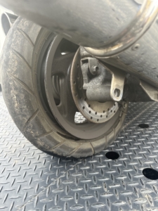 後輪のタイヤが完全にパンクして空気が抜け、ペチャンコになってしまっている状態でした。マジェスティのようなビッグスクーターは車体重量があるため、パンクした状態で無理に押して移動させようとするのは、バランスを崩して転倒する恐れがあり大変危険です。
