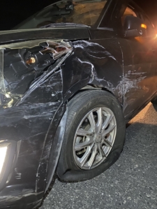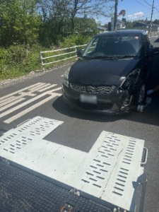 現場に到着してお車を確認したところ、左前部(フロントバンパーからフェンダーにかけて)が衝突により激しく損傷していました。バンパーが大きくえぐれるように割れて内部が剥き出しになっており、足回りへの干渉や走行中の部品落下の危険性が高いため、自走での移動は極めて危険と判断いたしました。