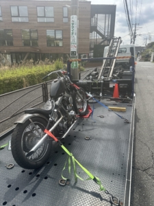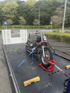 まずは二次被害を防ぐため、周囲の安全を確保した上で、剥がれかけたバンパー部分を緑色のテープで応急的に固定する処置を行いました。その後、フラットベッド型の積載車へお車を慎重に積み込み、タイヤを車輪止めでしっかりとロックして安全にレッカー搬送を実施いたしました。