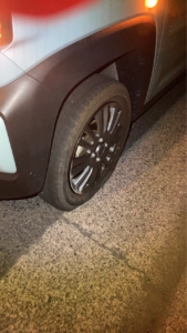 タイヤのパンクによるレッカー救援依頼をいただきました。現場に到着して確認したところ、タイヤが完全に潰れてしまっており、自走は不可能な状態でした。